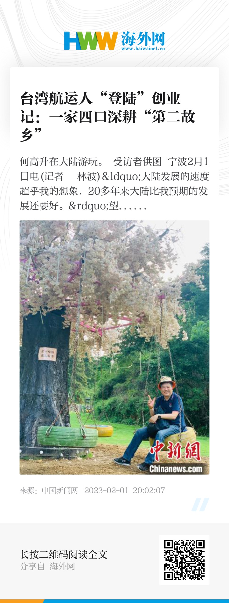 中新网宁波2月1日电(记者 林波)“大陆发展的速度超乎我的想象,20多年来大陆比我预期的发展还要好。”望着宁波舟山港码头上整齐排列的集装箱,台湾航运人何高升于近日接受采访时表示,自2002年来到大陆创业创新,他见证了大陆航运业的转型升级,也有幸与大陆发展同频共振,“一家四口在这里安居乐业,幸福感满满。”