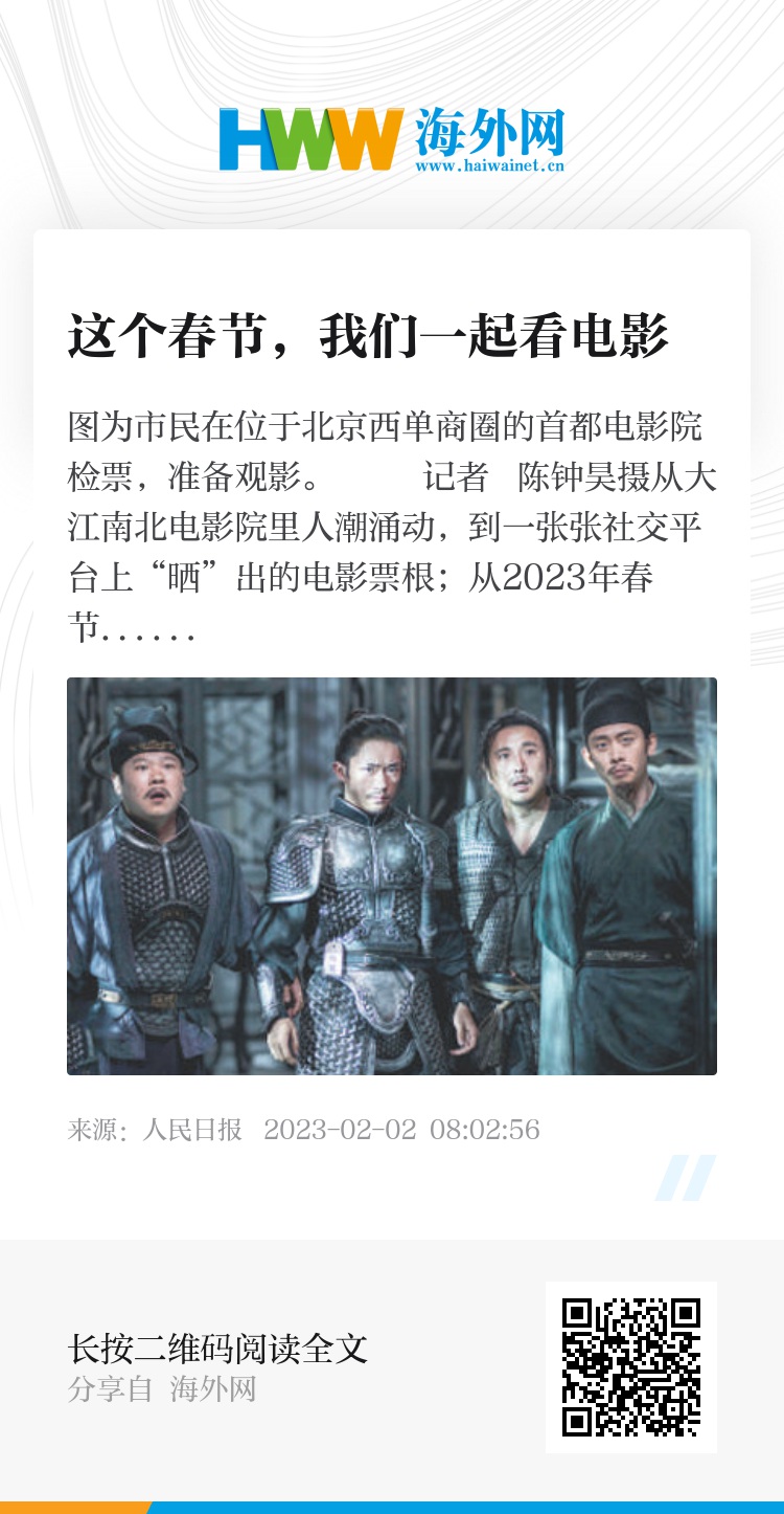 记者的话:《满江红》这样一部融合喜剧、悬疑等元素的大片满足了观众的多种需求。我注意到,院线在排片方面比较充分,取得较高票房也在情理之中。今年的春节档影片汇集了喜剧、科幻、悬疑、谍战、动画等类型,选择众多,很多影迷不止一次走入电影院。观众的观影热情还在持续释放,希望有好的电影源源不断上映,让这种态势一直延续。