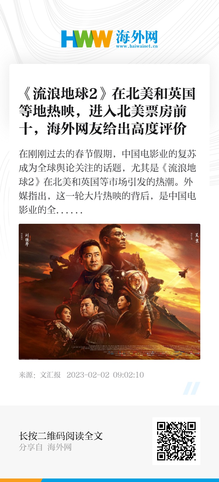 对海外华人来说,选在中国农历正月初一上映的《流浪地球2》更引发观影热潮。在洛杉矶、温哥华等华人较多的北美城市,《流浪地球2》场场爆满,一票难求。在北美知名影评网站“烂番茄”上,《流浪地球2》的“番茄值”为8.1,观众好评度高达97%。评论称,该片是一部“快节奏的科幻电影”“叙事宏伟”“角色幽默,有戏剧冲突”也“非常烧脑”。
