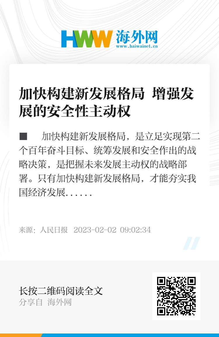 新华社北京2月1日电 中共中央政治局1月31日下午就加快构建新发展格局进行第二次集体学习。中共中央总书记习近平在主持学习时强调,加快构建新发展格局,是立足实现第二个百年奋斗目标、统筹发展和安全作出的战略决策,是把握未来发展主动权的战略部署。只有加快构建新发展格局,才能夯实我国经济发展的根基、增强发展的安全性稳定性,才能在各种可以预见和难以预见的狂风暴雨、惊涛骇浪中增强我国的生存力、竞争力、发展力、持续力,确保中华民族伟大复兴进程不被迟滞甚至中断,胜利实现全面建成社会主义现代化强国目标。