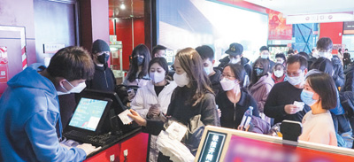 图为市民在位于北京西单商圈的首都电影院检票,准备观影。