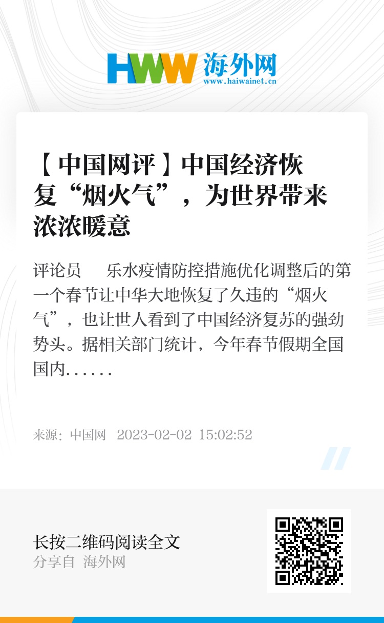 疫情防控措施优化调整后的第一个春节让中华大地恢复了久违的“烟火气”,也让世人看到了中国经济复苏的强劲势头。据相关部门统计,今年春节假期全国国内旅游出游人次达3.08亿,同比增长23.1%;春节档观影人次突破1亿,票房达67.58亿元,位居中国电影史上同期票房第二名;春节期间全国重点零售和餐饮企业销售额比去年农历同期增长6.8%。在经历了去年的疫情严重冲击之后,今年的中国消费市场供需两旺,呈现爆发式增长,体现出中国经济的强大韧性。