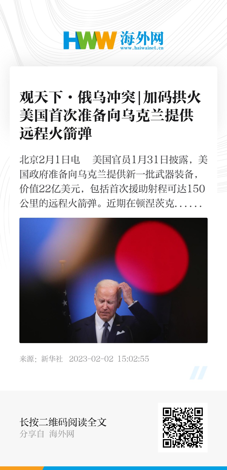 新华社北京2月1日电 美国官员1月31日披露,美国政府准备向乌克兰提供新一批武器装备,价值22亿美元,包括首次援助射程可达150公里的远程火箭弹。