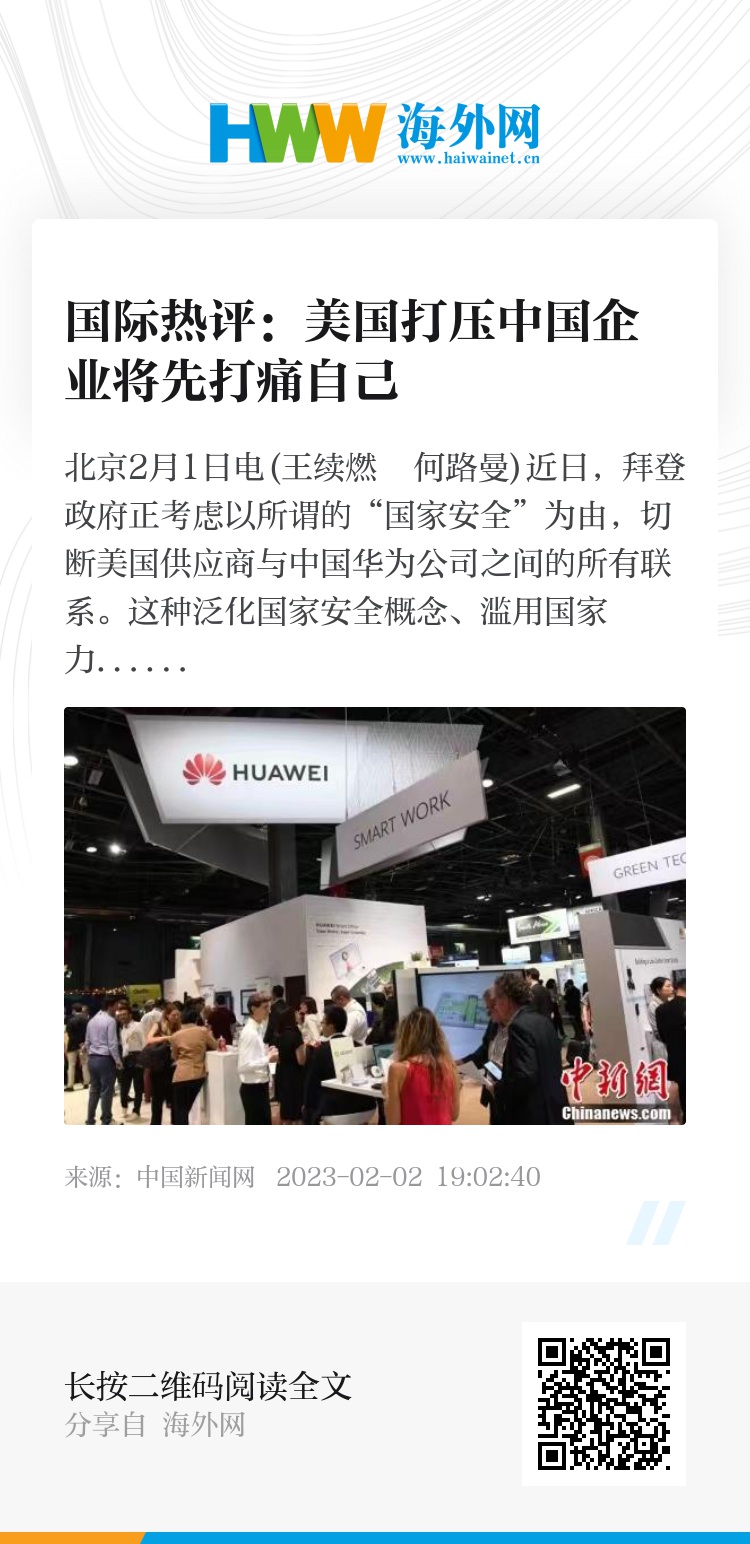 中新网北京2月1日电(王续燃 何路曼)近日,拜登政府正考虑以所谓的“国家安全”为由,切断美国供应商与中国华为公司之间的所有联系。这种泛化国家安全概念、滥用国家力量、无理打压中国企业的举动是赤裸裸的科技霸权,终将令美国自食其果。