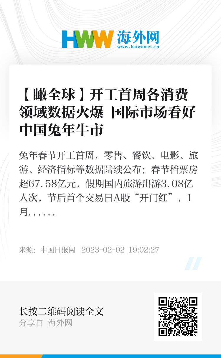 兔年春节开工首周,零售、餐饮、电影、旅游、经济指标等数据陆续公布:春节档票房超67.58亿元,假期国内旅游出游3.08亿人次,节后首个交易日A股“开门红”,1月份中国制造业采购经理指数(PMI)重回扩张区间……各领域市场数据表现亮眼,坚定了外界对中国经济的信心。