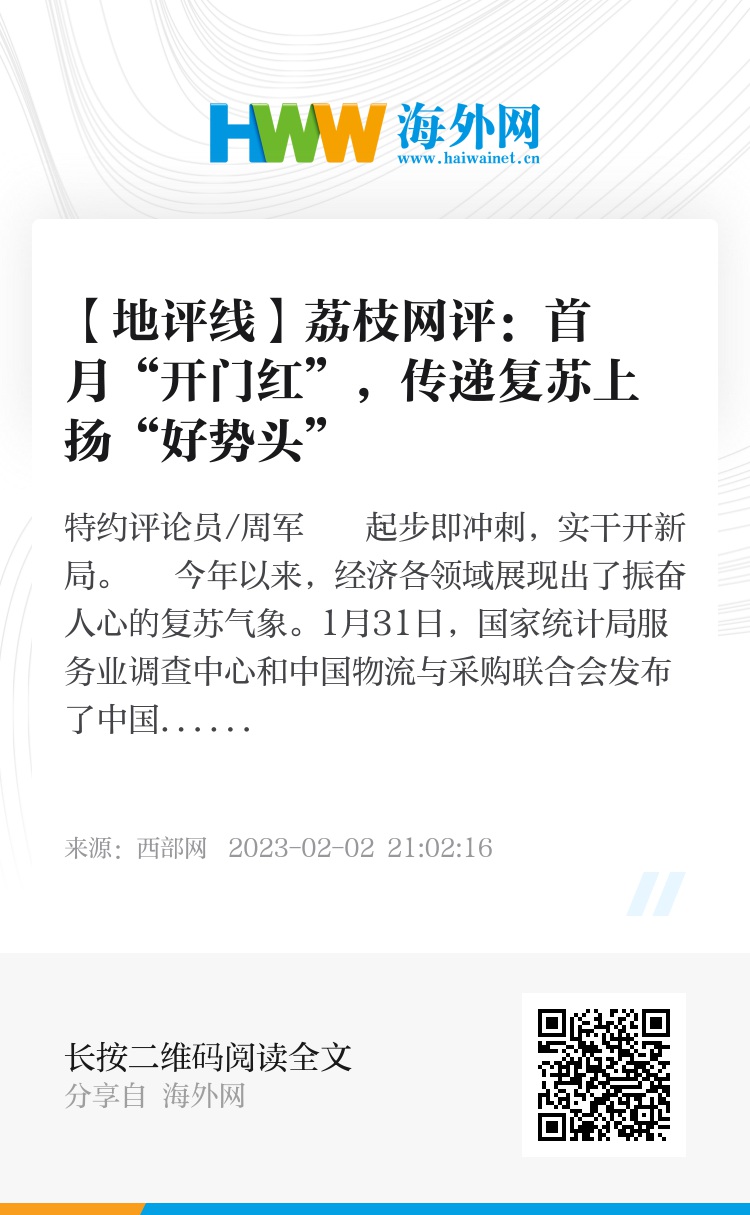 以什么样的状态开局、以什么样的劲头起跑,将决定我们这一年收获什么样的事业。奋发“兔”强、奋跃而上,各地在政策指导中奋发有为,在开局好势头中奋勇搏击,让这个开年多领域实现了“开门红”“开门稳”。乘势而上、迎春追光,奔赴经济高质量发展的新高地,我们信心倍增、自信满怀。(周军)