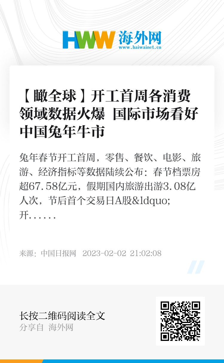 兔年春节开工首周,零售、餐饮、电影、旅游、经济指标等数据陆续公布:春节档票房超67.58亿元,假期国内旅游出游3.08亿人次,节后首个交易日A股“开门红”,1月份中国制造业采购经理指数(PMI)重回扩张区间……各领域市场数据表现亮眼,坚定了外界对中国经济的信心。