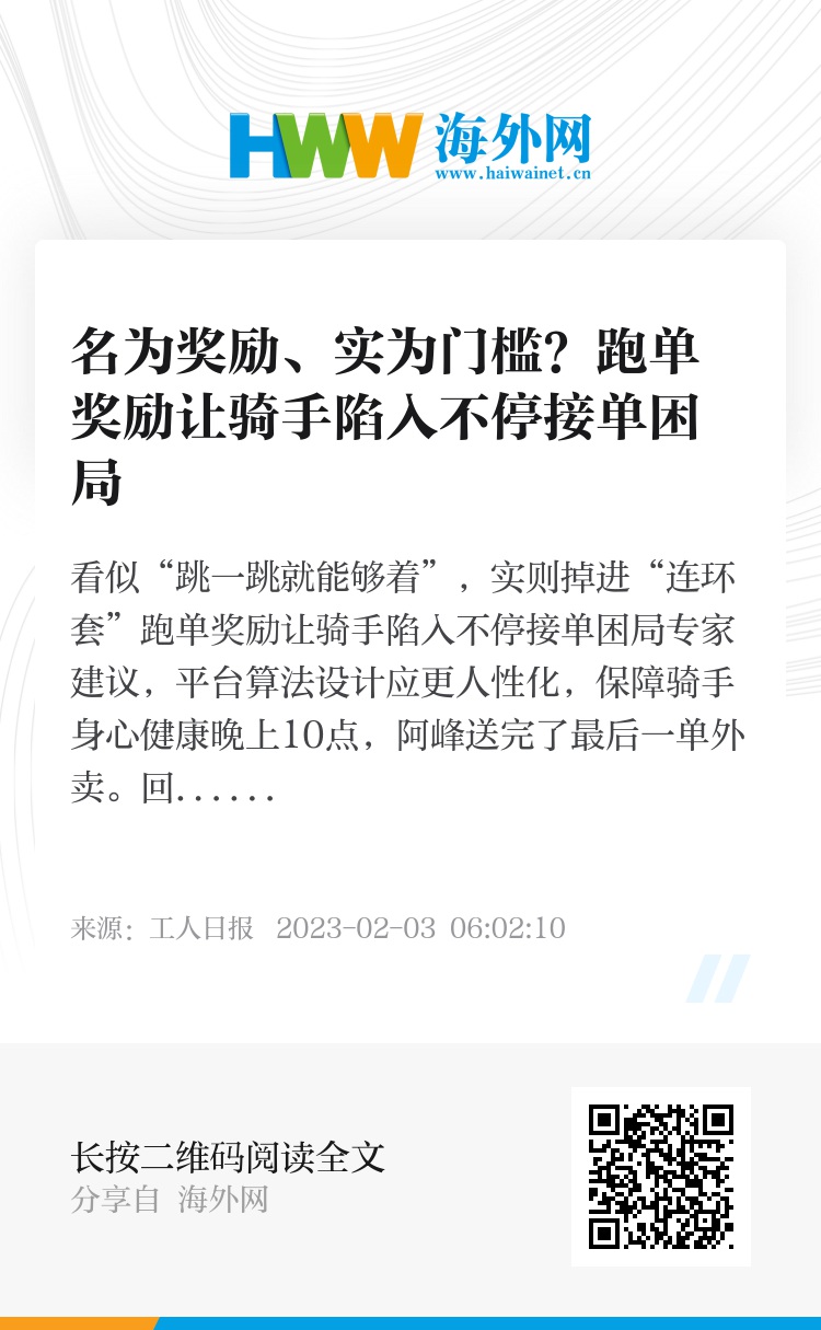“不可否认,跑单奖励活动对于增加骑手收入、激发其工作积极性具有积极影响,但骑手应根据身体情况选择合适的工作量,不要把获奖励看作是必须完成的任务。”郭元凯建议,平台应将算法设计得更加人性化,保障骑手的身心健康。(记者刘小燕)