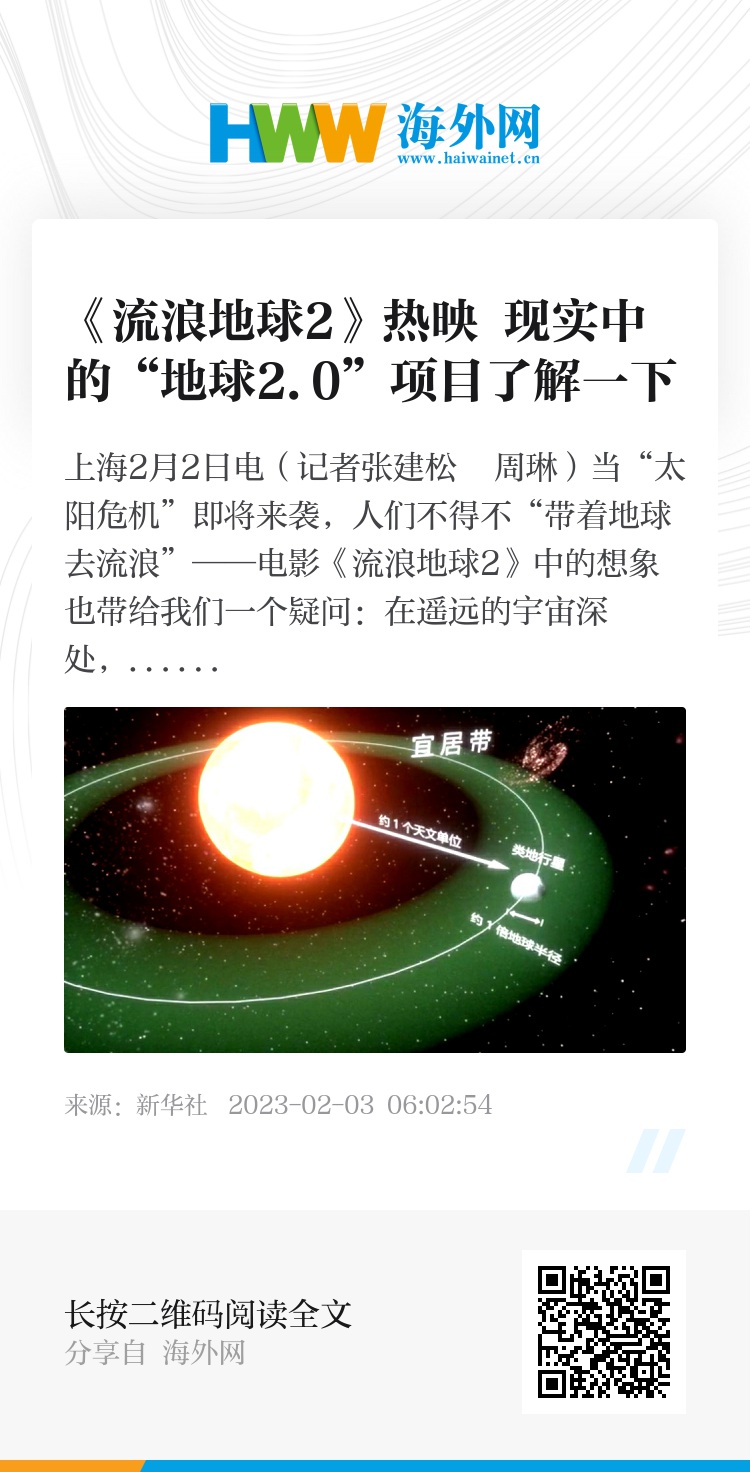 新华社上海2月2日电(记者张建松 周琳)当“太阳危机”即将来袭,人们不得不“带着地球去流浪”——电影《流浪地球2》中的想象也带给我们一个疑问:在遥远的宇宙深处,我们可以寻找到“第二家园”,让地球不需“流浪”吗?事实上,一群科学家和工程人员已经开始着手“地球2.0”计划,他们将对银河系类地行星进行“普查”,寻找下一个人类家园。
