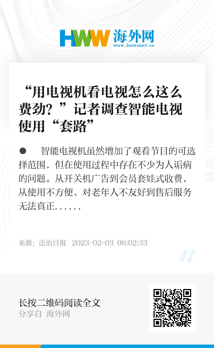 近年来,从有线到数字再到网络,电视机技术飞速发展,如今的智能电视机在联网后,大大增加了观看节目的可选择范围。然而,《法治日报》记者近日调查发现,智能电视机在使用过程中存在不少为人诟病的问题。从开关机广告到会员套娃式收费,从使用不方便、对老年人不友好到售后服务无法真正解决问题,智能电视机的一系列“套路”亟待改进。