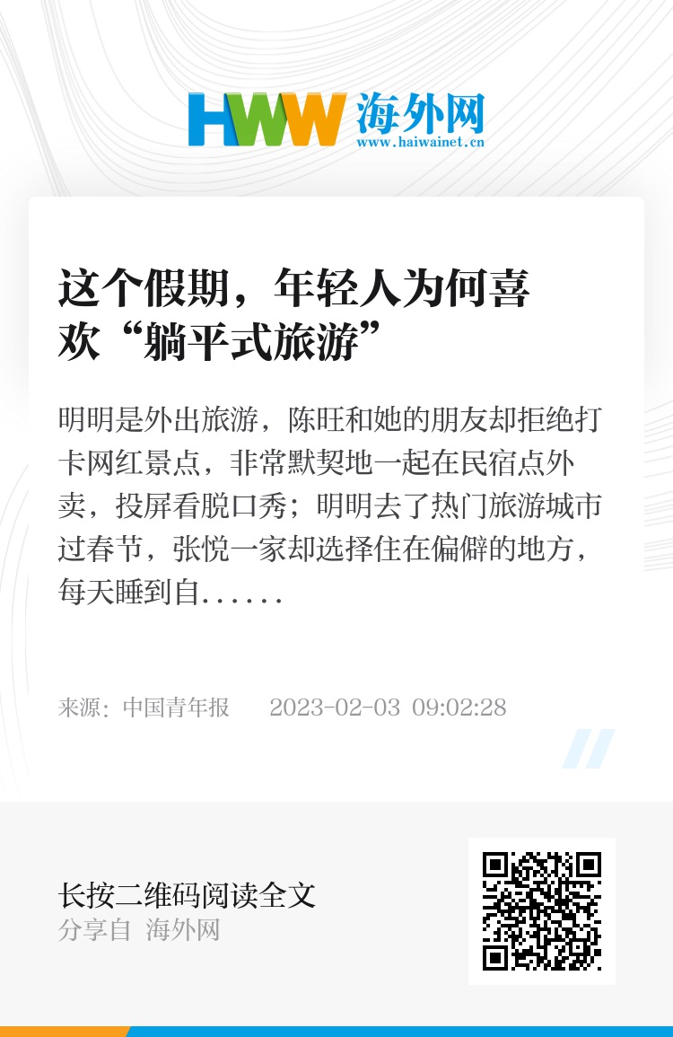 相比以往攻略详细、准备充足的“打鸡血式旅游”,这届年轻人开始了“躺平式旅游”,他们不再挤破头打卡网红景点,拍全是“后脑勺”的游客风景照,跟随必吃榜在餐厅门口排长队。轻松、陪伴、享受成为“躺平式旅游”的关键词。