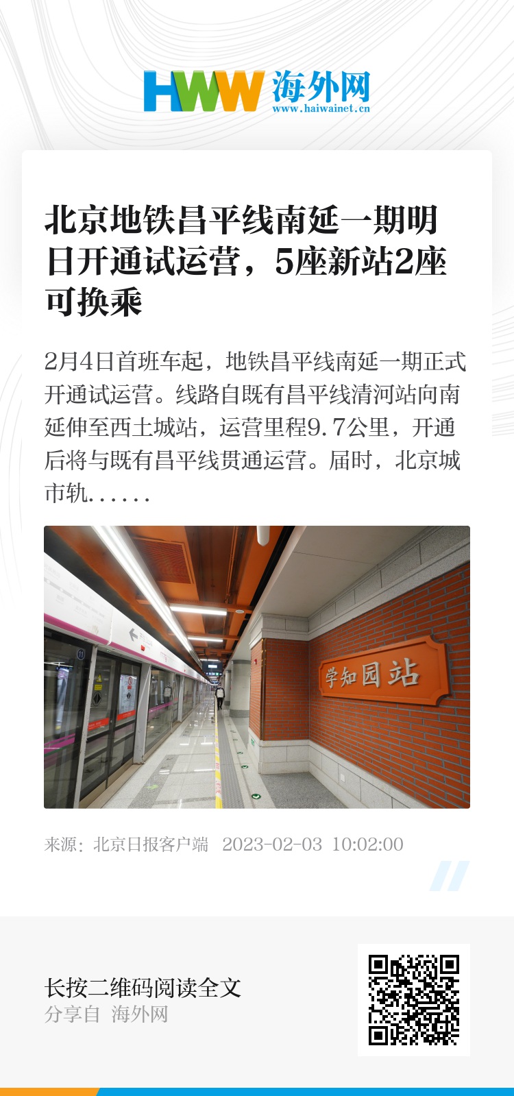 2月4日首班车起,地铁昌平线南延一期正式开通试运营。线路自既有昌平线清河站向南延伸至西土城站,运营里程9.7公里,开通后将与既有昌平线贯通运营。届时,北京城市轨道交通线路共计27条,运营总里程达807公里,轨道交通线网的通达性和便利性有效提升。
