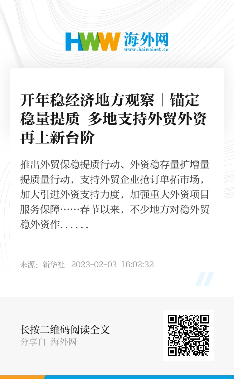 推出外贸保稳提质行动、外资稳存量扩增量提质量行动,支持外贸企业抢订单拓市场,加大引进外资支持力度,加强重大外资项目服务保障……春节以来,不少地方对稳外贸稳外资作出一系列部署,推出针对性举措,力求在去年稳增长基础上提质促优。接受《经济参考报》记者采访的专家表示,各地纷纷靠前发力,将有效激发市场活力,力保“开门红”,也为全年外贸外资稳量提质打下基础。