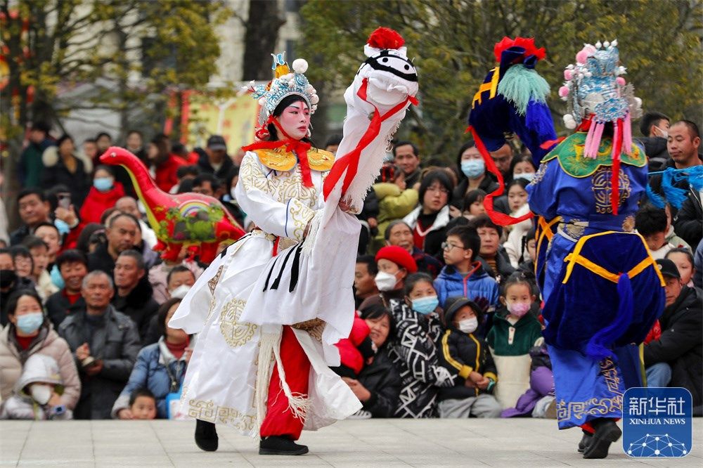 2月1日,民间艺人在安徽省黄山市黄山区表演跳竹马。新华社发(施亚磊 摄)