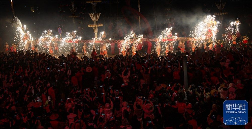 1月31日晚,民间艺人在广东省揭阳市揭东区磐东街道表演国家级非物质文化遗产——乔林烟花火龙,吸引大量市民游客。新华社发(黄广平 摄)