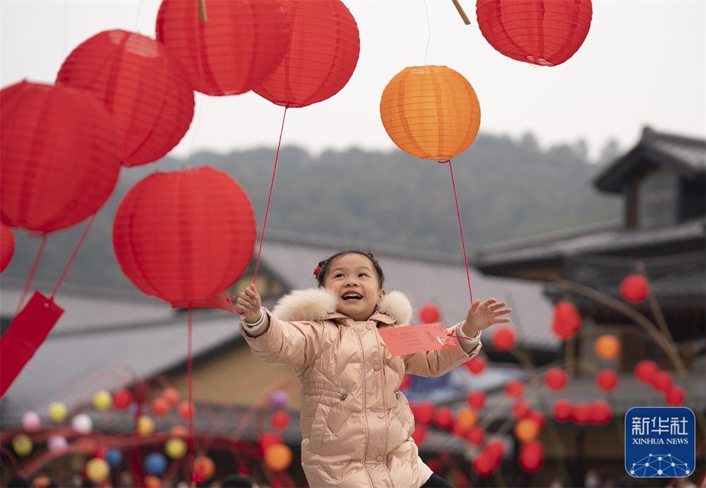 2月1日,一名小朋友在江西省新余市仙女湖区宽心小镇宋韵民俗主题灯会上玩耍。新华社发(赵春亮 摄)