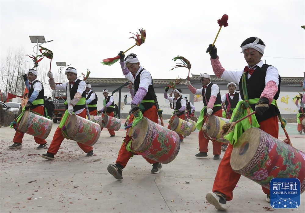 2月1日,乡村秧歌队在甘肃省临夏回族自治州积石山保安族东乡族撒拉族自治县表演秧歌节目“太平鼓”。新华社发(史有东 摄)
