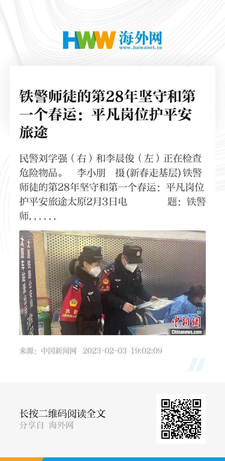 “各位旅客,春运期间出行人多拥挤,请大家过安检后及时检查自己随身携带的行李物品,以免遗漏或误拿影响后续出行。”2023年春运正在进行,山西太原火车站进站口,民警刘学强和李晨俊穿梭在人群中,不断向旅客发出提醒。
