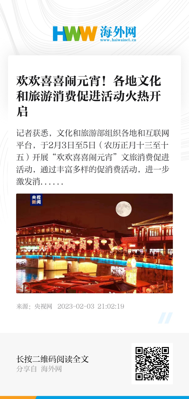 记者获悉,文化和旅游部组织各地和互联网平台,于2月3日至5日(农历正月十三至十五)开展“欢欢喜喜闹元宵”文旅消费促进活动,通过丰富多样的促消费活动,进一步激发消费活力,促进文化和旅游消费加快恢复。