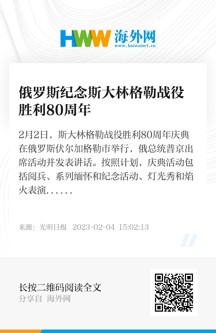 2月2日,斯大林格勒战役胜利80周年庆典在俄罗斯伏尔加格勒市举行,俄总统普京出席活动并发表讲话。按照计划,庆典活动包括阅兵、系列缅怀和纪念活动、灯光秀和焰火表演等。近日,全俄各地民众以多种方式缅怀先烈,包括1日举行的180名在斯大林格勒战役中阵亡红军烈士遗骸安葬仪式等。