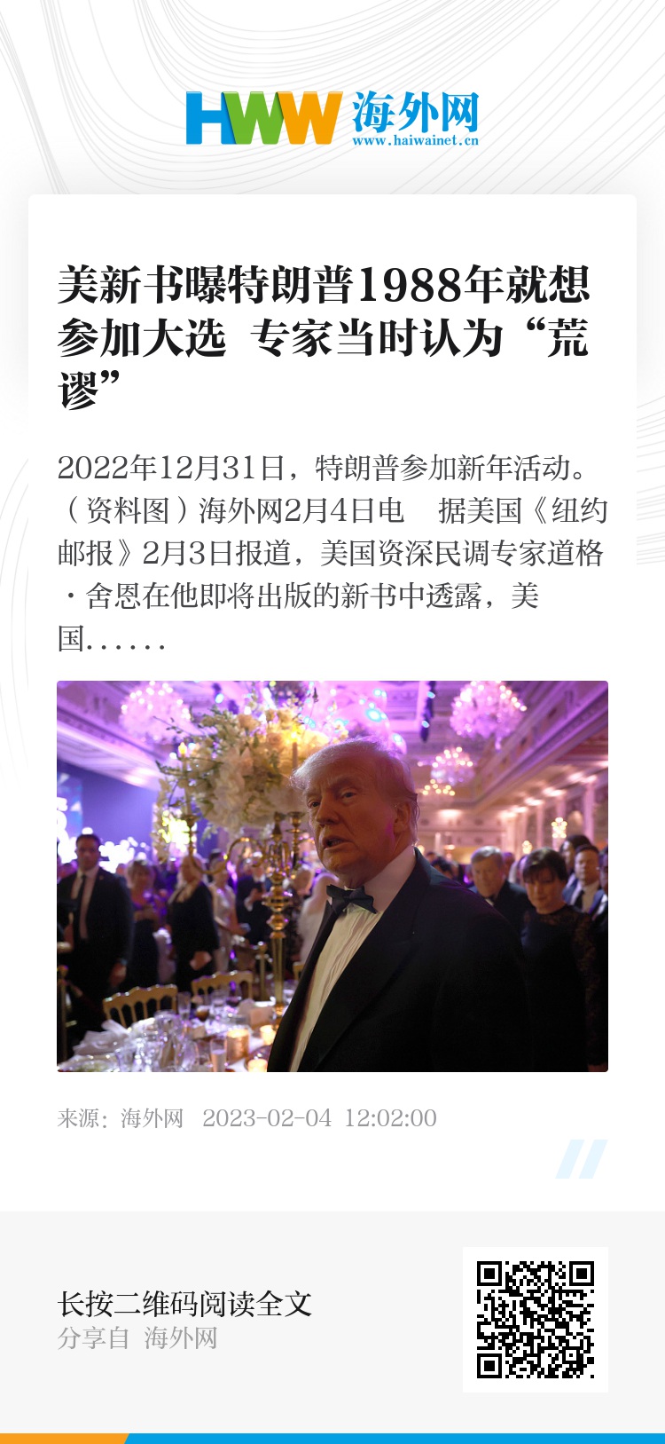 海外网2月4日电 据美国《纽约邮报》2月3日报道,美国资深民调专家道格·舍恩在他即将出版的新书中透露,美国前总统特朗普首次打算竞选总统是在1988年。舍恩当时认为他的想法是“荒谬的”。