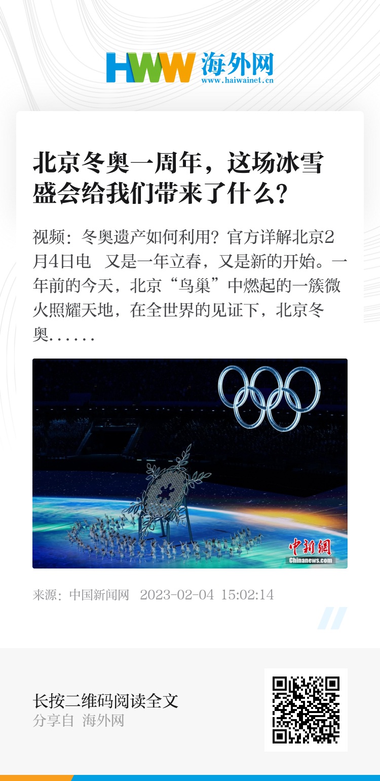 北京冬奥会举行一周年前夕,《北京2022年冬奥会和冬残奥会遗产报告(赛后)》发布。其中指出,北京冬奥会不仅是一场精彩纷呈的体育盛会,更创造和带来了丰厚的冬奥遗产。