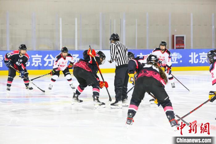 第九届全国大众冰雪季北京分会场,两支北京青年女子冰球队伍展开对抗 胡宗洋 摄