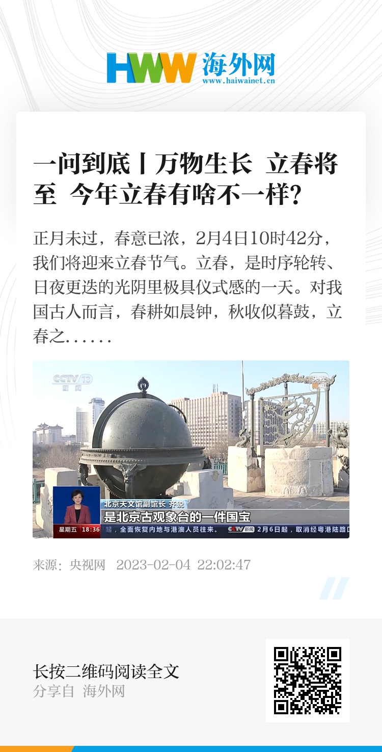 正月未过,春意已浓,2月4日10时42分,我们将迎来立春节气。立春,是时序轮转、日夜更迭的光阴里极具仪式感的一天。对我国古人而言,春耕如晨钟,秋收似暮鼓,立春之日寓意盛大。立春,终而有始,万象更新,“从此雪消风自软,梅花合让柳条新”。关于立春,您了解多少呢?您知道这个癸卯兔年的立春有什么不同吗?“一年两头春”、立春元宵喜相连又有多么难得?“打春”“咬春”,您准备好了吗?一起来了解一下今年的立春有何特别之处。
