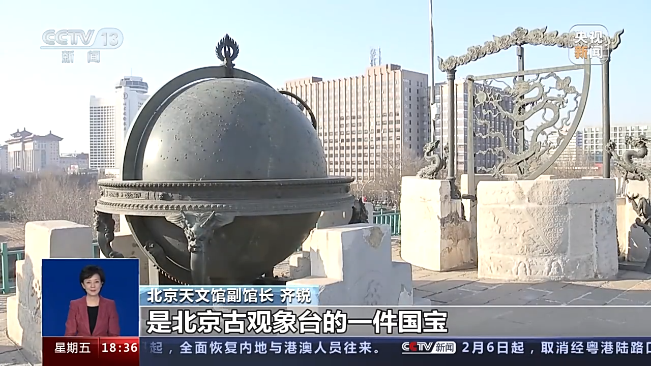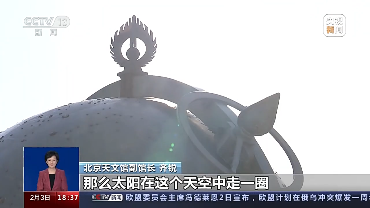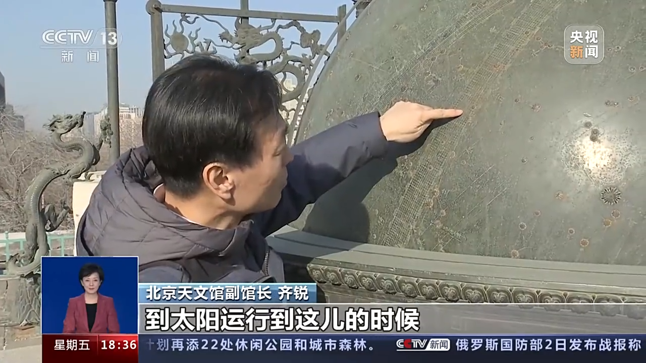 北京天文馆副馆长 齐锐:我身后的是北京古观象台的一件国宝,叫天体仪。它实际上反映的是我们头上这片星空和日月。这上面明显有一条天上的路线,是什么呢?这就是太阳在天空中运行的轨道,我们把它叫黄道,太阳每天从这边向那边走那么一点点,一年正好走一圈。立春这一天,就是太阳正好走到了黄道的位置。