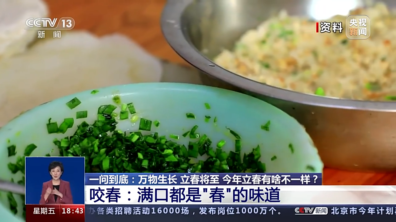 都说吃了立春饭,一天暖一天。立春这一天怎么少得了“春盘”。虽然不同年代的春盘略有不同,但生菜、萝卜丝、韭菜依然是春盘的“看家菜”。立春“咬春”,把春天的各色味道都卷进饼里,用极薄的面皮包裹上新鲜的时令蔬菜,卷成卷蒸熟或者油炸,细品“咬春”,满口都是春的味道。(总台央视记者 鲁念)