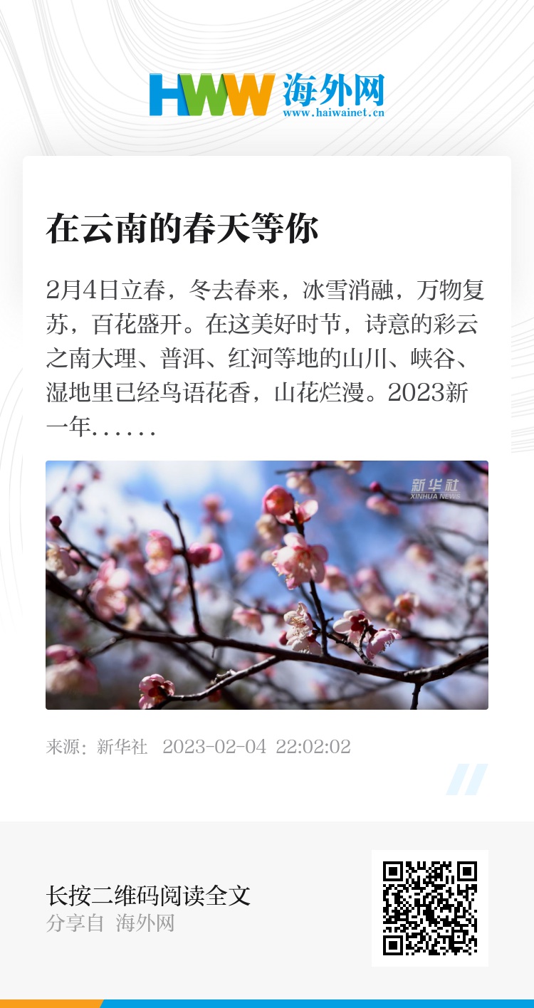 2月4日立春,冬去春来,冰雪消融,万物复苏,百花盛开。在这美好时节,诗意的彩云之南大理、普洱、红河等地的山川、峡谷、湿地里已经鸟语花香,山花烂漫。2023新一年所有的期待开始启程,在花开的地方等你,在有风的地方等你,在云南的春天等你。