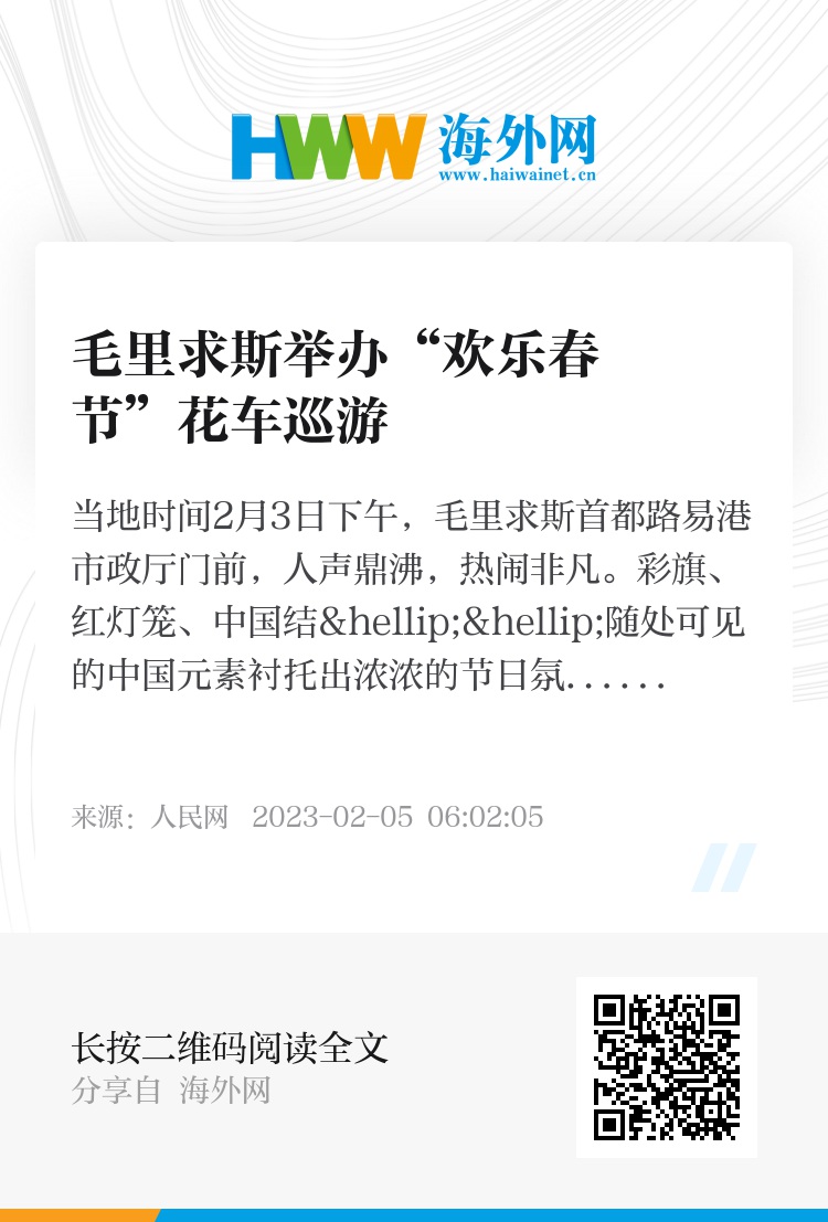 当地时间2月3日下午,毛里求斯首都路易港市政厅门前,人声鼎沸,热闹非凡。彩旗、红灯笼、中国结……随处可见的中国元素衬托出浓浓的节日氛围。