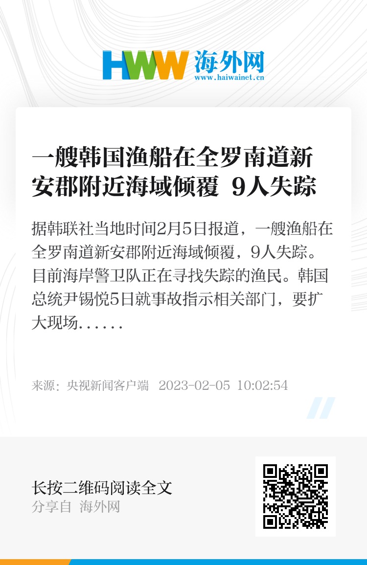 据韩联社当地时间2月5日报道,一艘渔船在全罗南道新安郡附近海域倾覆,9人失踪。目前海岸警卫队正在寻找失踪的渔民。