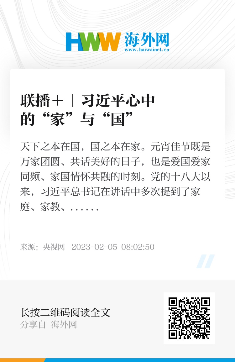 天下之本在国,国之本在家。元宵佳节既是万家团圆、共话美好的日子,也是爱国爱家同频、家国情怀共融的时刻。党的十八大以来,习近平总书记在讲话中多次提到了家庭、家教、家风,深刻阐述了家庭与社会、家庭与国家之间的关系。央视网《联播+》特推出海报,与您一起感悟总书记的家国情怀。