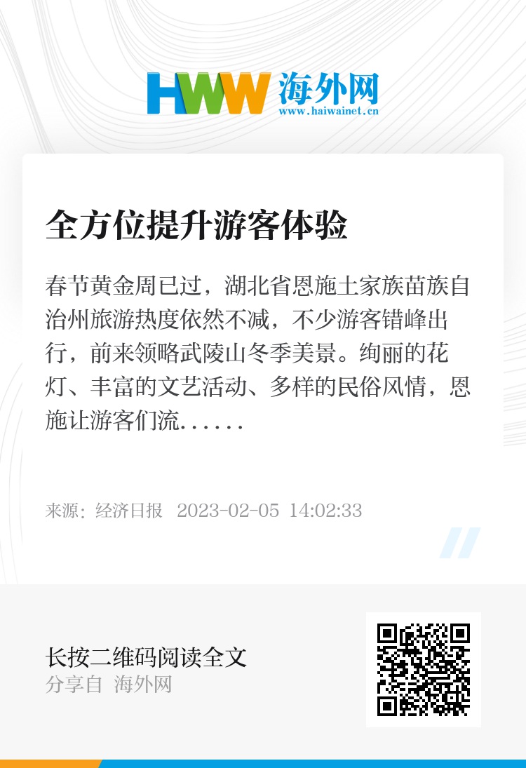 “今年恩施春节旅游格外火热,全州旅游经济总量已全面恢复至2019年同期水平。”恩施州文化和旅游局党组书记、局长邵爱华说,可以预见,假日经济的高增长、快恢复,将极大提振行业信心、消费信心、市场信心,激励文旅市场持续向好。
