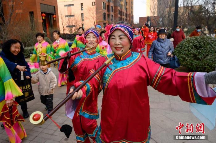 资料图:山西省太原市,由演员扮演的“媒婆”在社区表演社火,庆祝元宵节。 中新社记者 韦亮 摄