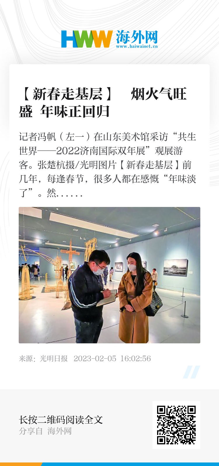 记者冯帆(左一)在山东美术馆采访“共生世界——2022济南国际双年展”观展游客。张楚杭摄/光明图片