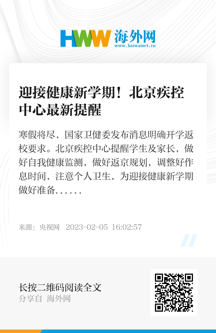 寒假将尽,国家卫健委发布消息明确开学返校要求。北京疾控中心提醒学生及家长,做好自我健康监测,做好返京规划,调整好作息时间,注意个人卫生,为迎接健康新学期做好准备。