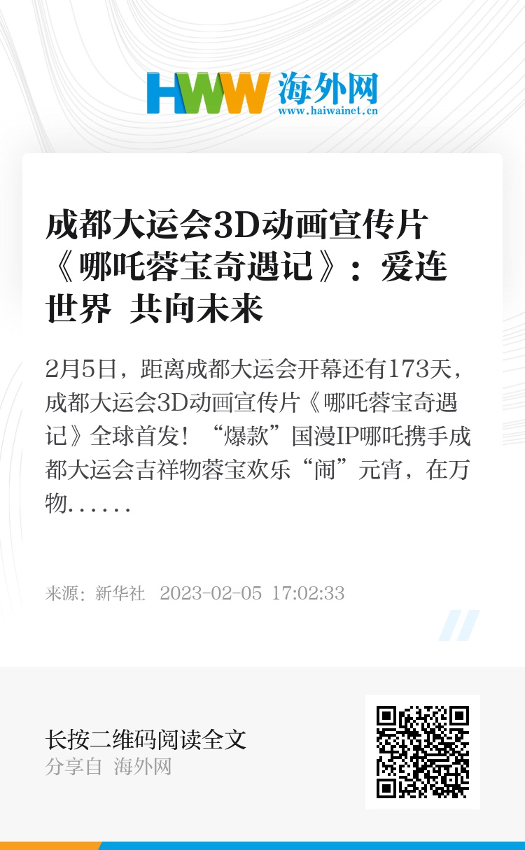 2月5日,距离成都大运会开幕还有173天,成都大运会3D动画宣传片《哪吒蓉宝奇遇记》全球首发!“爆款”国漫IP哪吒携手成都大运会吉祥物蓉宝欢乐“闹”元宵,在万物复苏的时节,邀约世界。