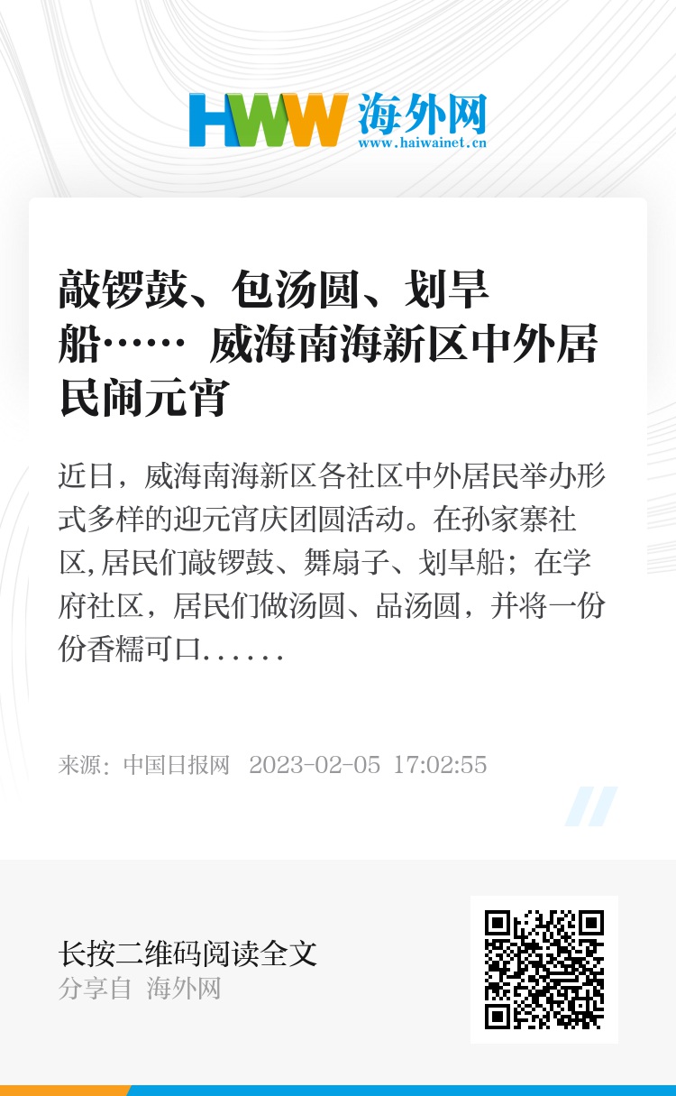 近日,威海南海新区各社区中外居民举办形式多样的迎元宵庆团圆活动。在孙家寨社区,居民们敲锣鼓、舞扇子、划旱船;在学府社区,居民们做汤圆、品汤圆,并将一份份香糯可口的汤圆送到社区孤寡老人及困难群众手中,为他们送去节日的祝福。
