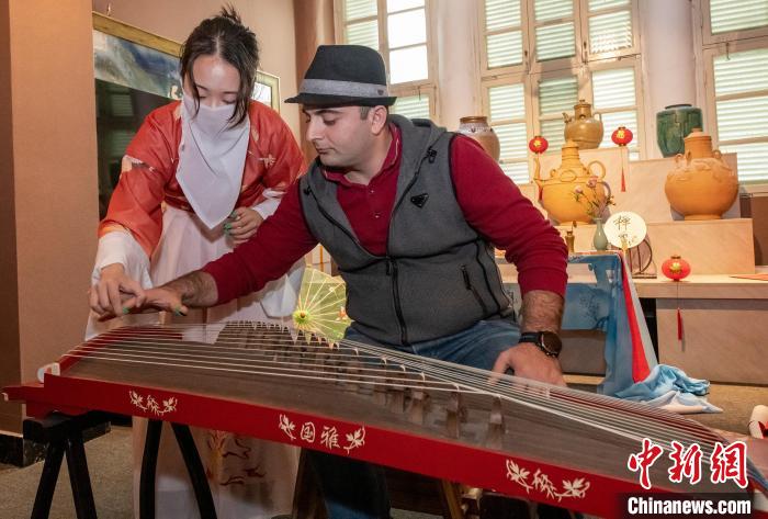 2月4日,40多位国际友人来到海口骑楼老街体验喜庆中国年。图为来自格鲁吉亚的乔治学弹古筝。 蒋聚荣 摄