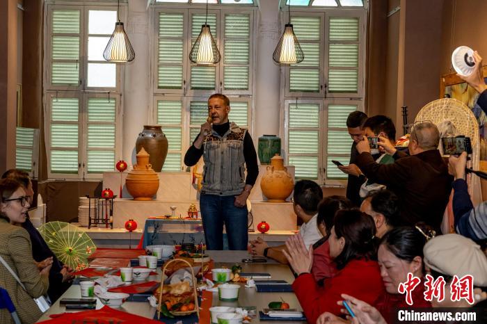 2月4日,40多位国际友人来到海口骑楼老街体验喜庆中国年。图为来自乌兹别克斯坦的王龙演唱中国歌曲。 蒋聚荣 摄