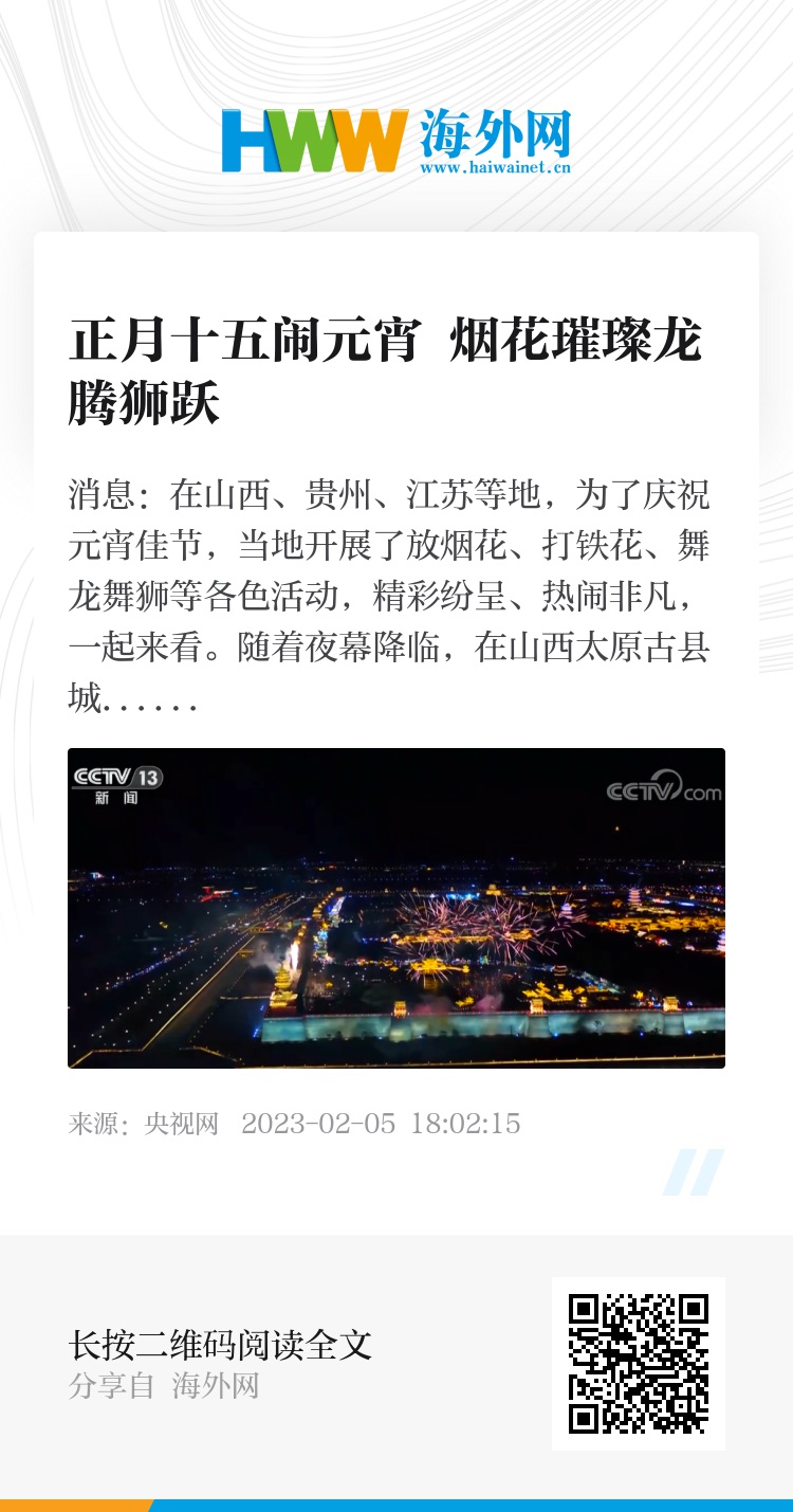 央视网消息:在山西、贵州、江苏等地,为了庆祝元宵佳节,当地开展了放烟花、打铁花、舞龙舞狮等各色活动,精彩纷呈、热闹非凡,一起来看。