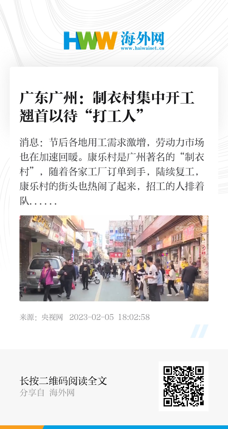 央视网消息:节后各地用工需求激增,劳动力市场也在加速回暖。康乐村是广州著名的“制衣村”,随着各家工厂订单到手,陆续复工,康乐村的街头也热闹了起来,招工的人排着队,翘首等待“打工人”。
