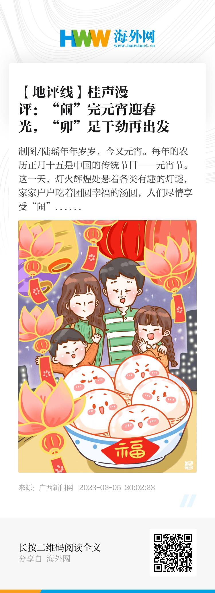 花灯耀四海,欢乐闹元宵。新年的余味还未完全散去,元宵节的花灯又点亮了我们的生活。如果说春节演绎了普天同庆的喜悦,元宵节则承载了新年的新希望。新的一年,希望与挑战并存,唯有动如脱兔般奋跃而上、飞速奔跑,才能在发展的赛道上创造新的奇迹。吃完一碗热气腾腾的元宵,就让我们“卯”足干劲开启新一年的奋斗,紧盯目标制定“作战图”,排好“时间表”,列出“任务单”,一步一个脚印把既定目标付诸行动、见之于成效,让中国发展的壮阔画卷再开新局,不断谱写全面建设社会主义现代化国家崭新篇章。(丁恒情)