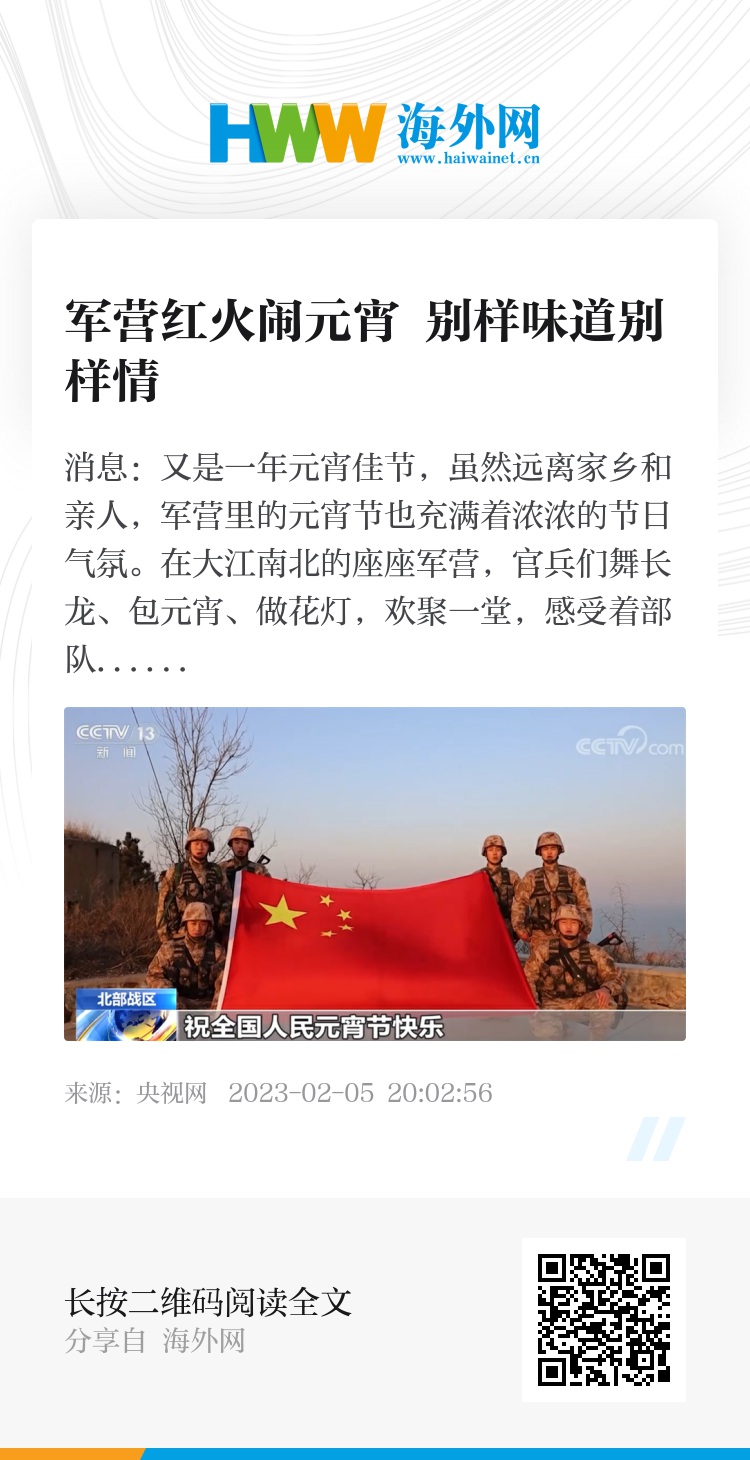 央视网消息:又是一年元宵佳节,虽然远离家乡和亲人,军营里的元宵节也充满着浓浓的节日气氛。在大江南北的座座军营,官兵们舞长龙、包元宵、做花灯,欢聚一堂,感受着部队大家庭的温暖。
