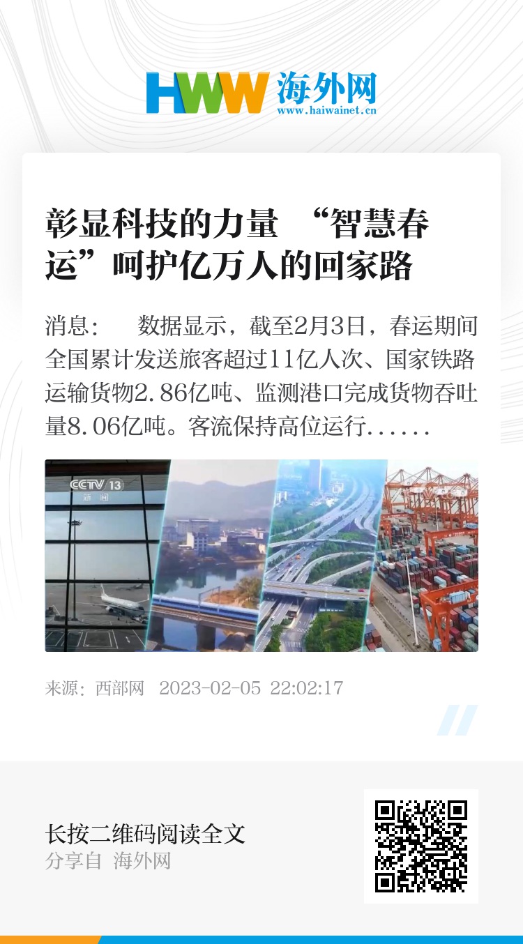 央视网消息:数据显示,截至2月3日,春运期间全国累计发送旅客超过11亿人次、国家铁路运输货物2.86亿吨、监测港口完成货物吞吐量8.06亿吨。客流保持高位运行,重点物资运输繁忙有序,可以说今年春运,客货运运输复苏回暖态势明显。春运接近尾声,今天的《春运微观察》我们将通过盘点的方式,带您看看春运背后的科技力量。