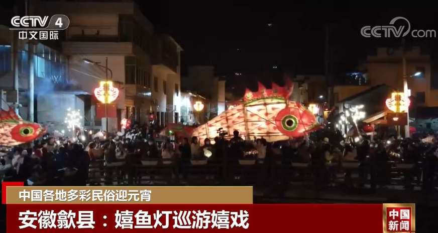 伴随着铿锵的锣鼓和绚丽的烟花,安徽歙县溪头镇汪满田村的鱼灯从村里的四面八方汇聚,6路鱼灯就像6个鱼群,你来我往地在村子里游走。大鱼灯长度7米左右,小鱼灯只有50厘米左右。大大小小的鱼灯排着长长的队伍沿着依河而建的村庄巡游嬉戏,精彩壮观。