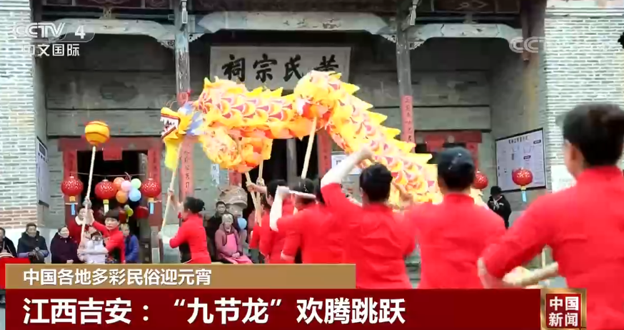 在江西吉安县敖城镇功阁村,伴随着欢快的鼓点,村里的女子舞龙队舞起九节布龙,用竹蓖编制而成的“九节龙”欢腾跳跃,喜庆又热闹。