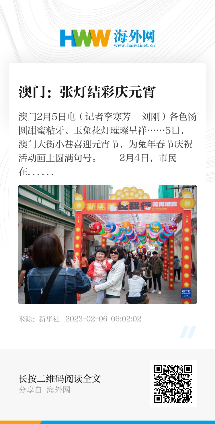 新华社澳门2月5日电(记者李寒芳 刘刚)各色汤圆甜蜜粘牙、玉兔花灯璀璨呈祥……5日,澳门大街小巷喜迎元宵节,为兔年春节庆祝活动画上圆满句号。